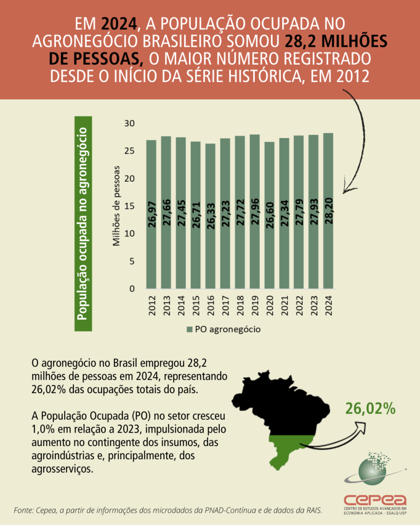 O agro brasileiro segue firme na liderança do mercado de trabalho nacional. Em 2024, o setor empregou 28,2 milhões de pessoas, um aumento de 1% (ou cerca de 278 mil postos de trabalho) em comparação com 2023, segundo levantamento do Cepea (Centro de Estudos Avançados em Economia Aplicada) em parceria com a CNA (Confederação da Agricultura e Pecuária do Brasil). Com isso, o agronegócio passou a representar nada menos que 26,02% de todas as ocupações do país.