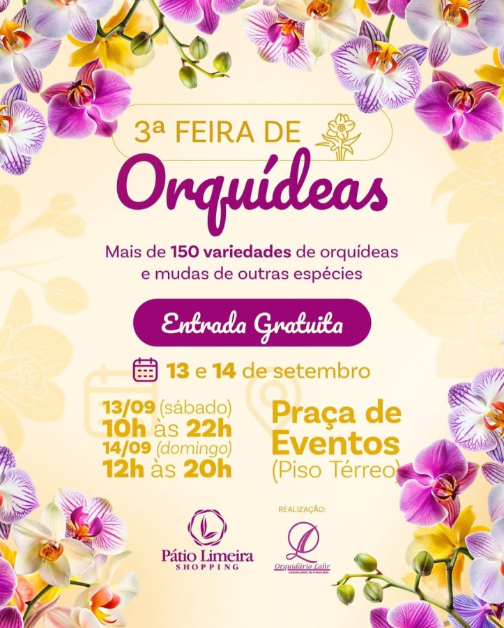 A primavera chega oficialmente só no fim de setembro, mas em Limeira ela vai dar as caras antes. Nos dias 13 e 14, o Pátio Limeira Shopping será palco da 3ª Feira de Orquídeas, uma programação especial que também celebra o aniversário da cidade, comemorado no dia 15.